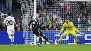 Merino blev fasthållen i straffområdet och efter en VAR-koll dömde domaren straff för gästerna. Saka klev fram och försökte lobba bollen men Real Madrids keeper läste det och räddade snyggt!